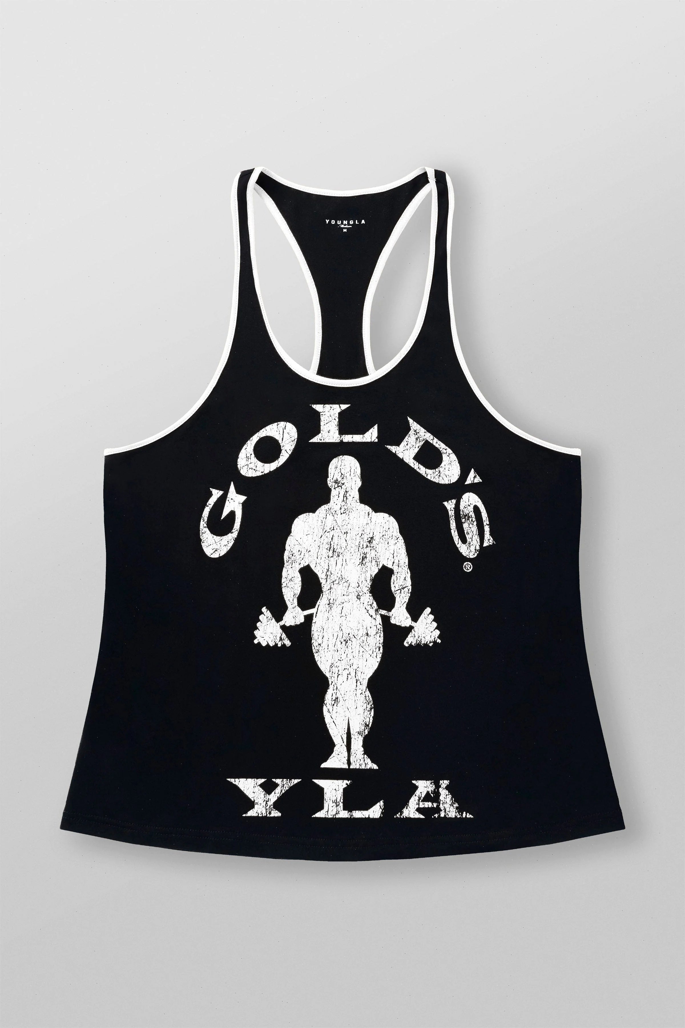 DESIGN: Presenting the YoungLA x Gold's Gym collaboration stringers – a classic piece with contrast piping that adds a timeless touch. Featuring a distressed-effect graphic on the front, these stringers honor Gold’s Gym’s legacy while showcasing YoungLA’s signature style. The fit is crafted from YoungLA's "perfect stringers" design, offering a comfortable and flattering look for any workout session.