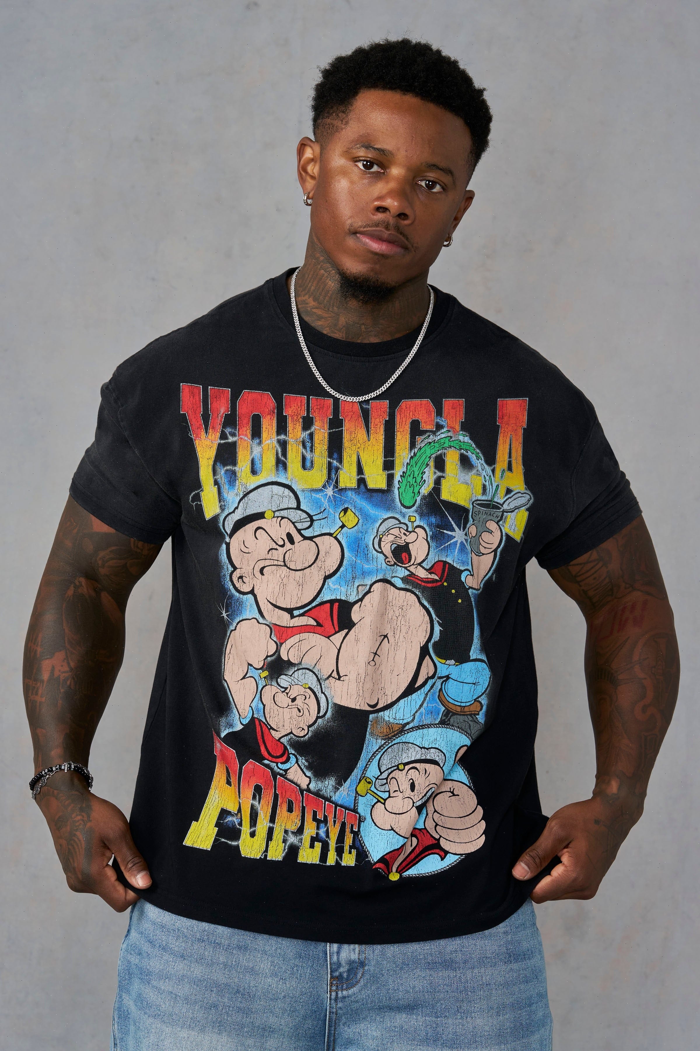 DESIGN: A bold, iconic Popeye graphic brought to life with a gritty, vintage treatment. Distressed detailing and oversized YoungLA lettering give it a worn-in, street-ready attitude.