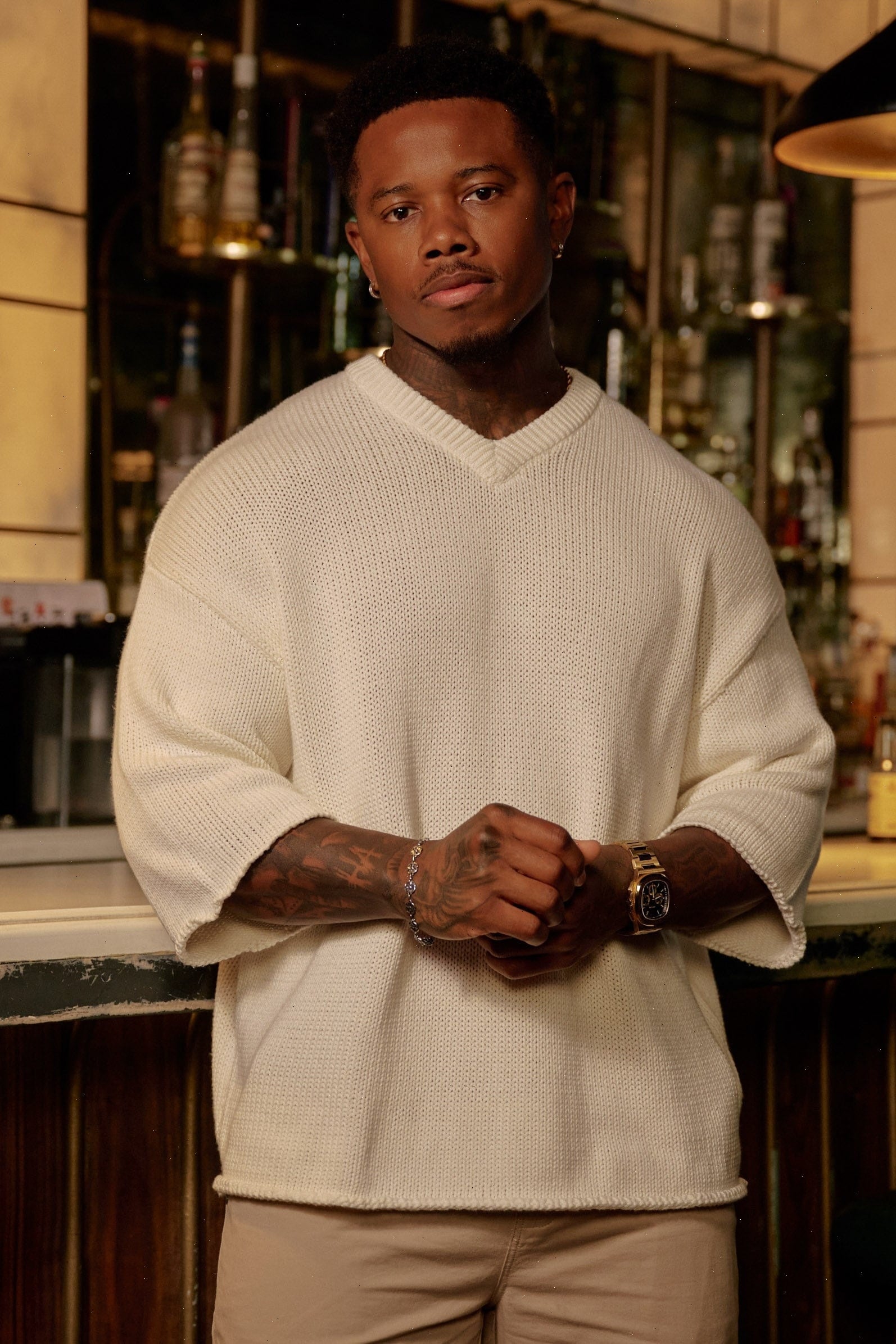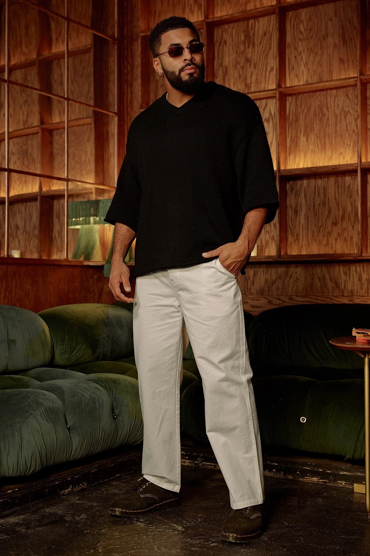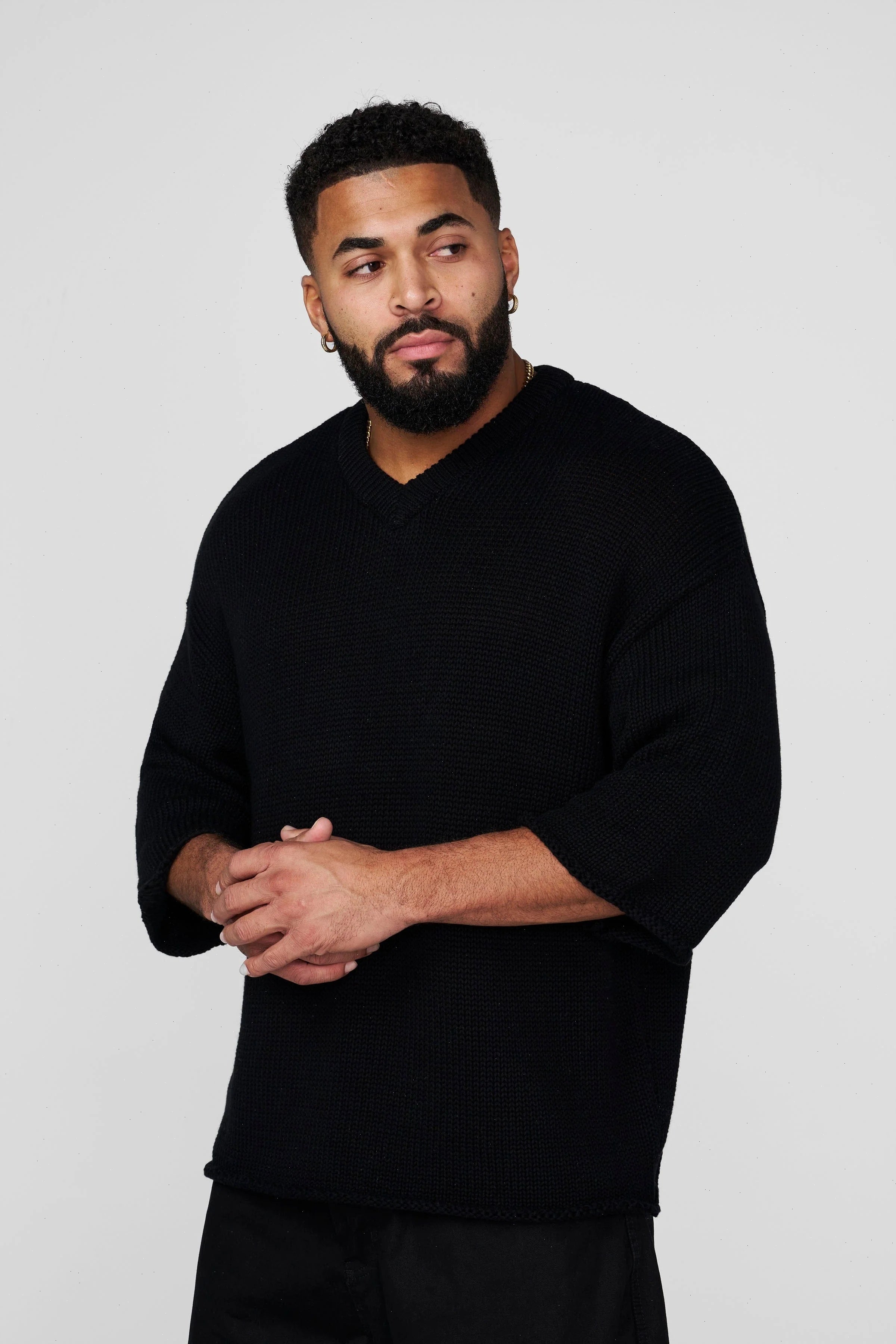 DESIGN: A relaxed, easy-wear knit built for comfort and simple styling. This sweater features an open-gauge cotton construction with a soft drape and a loose, oversized silhouette. Designed with a wide V-neckline, dropped shoulders, and mid-length sleeves for a casual, laid-back look. Finished with subtle raw-edge detailing along the hem to keep the fit effortless and lived-in. Works as a lightweight layer or a standalone top year-round.