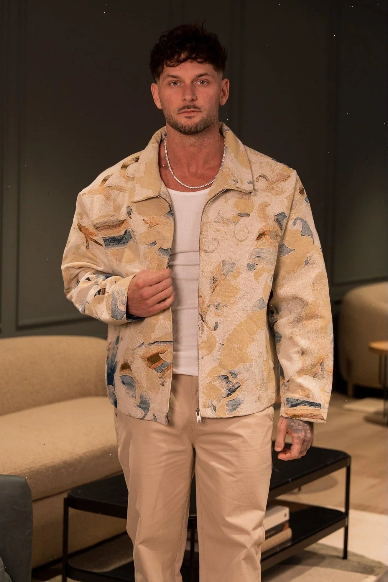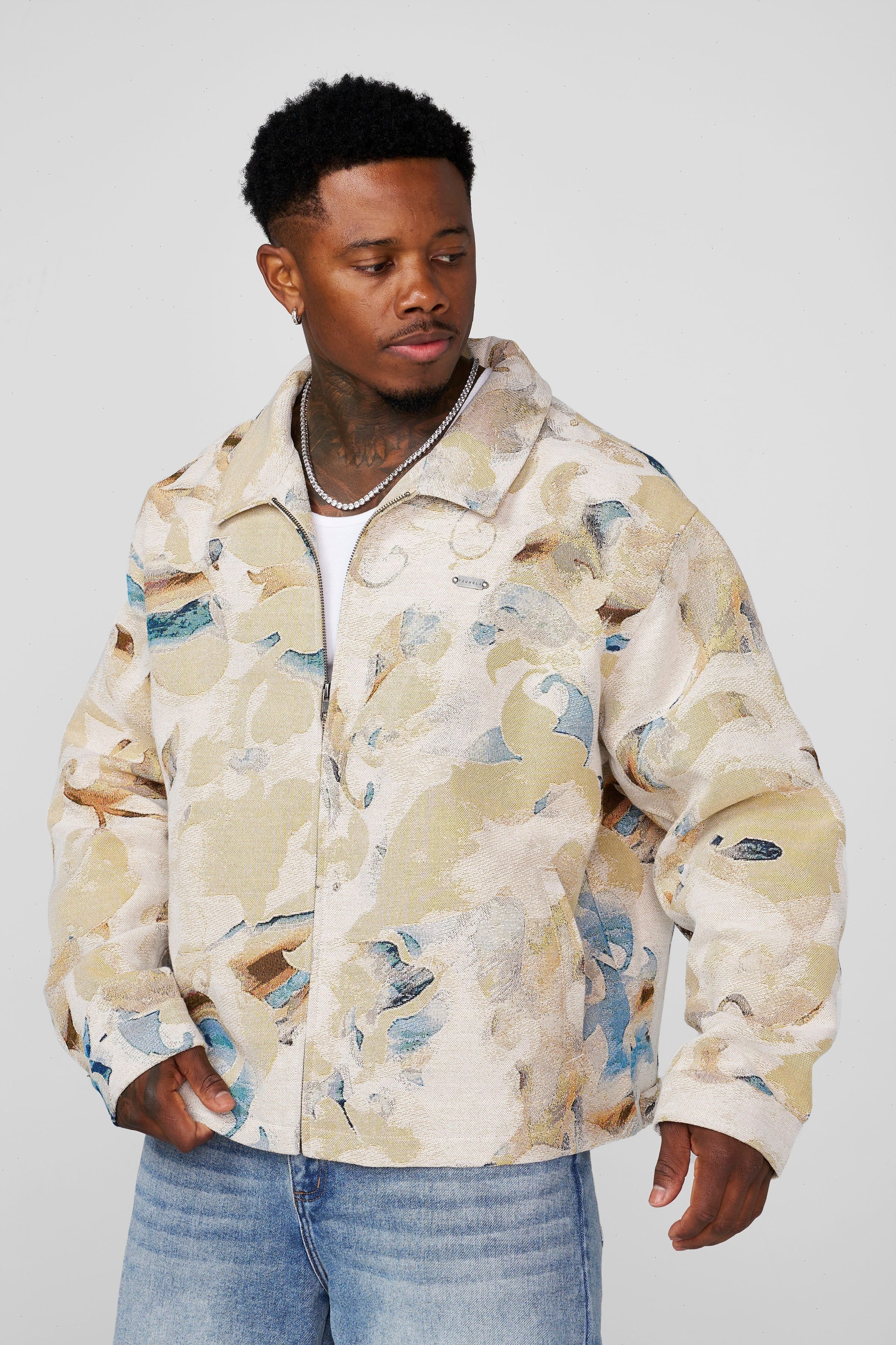 DESIGN: A standout tapestry-woven jacket featuring an all-over abstract pattern with rich texture and depth. Built from a heavyweight woven blend that gives the piece structure while still allowing a relaxed, drapey fit. The fabric’s jacquard-style detailing creates a premium, art-inspired surface with layered color tones throughout. Designed with a full zip front, spread collar, clean paneling, and subtle branding to keep the focus on the pattern. Soft lining adds comfort without taking away from the outer texture.