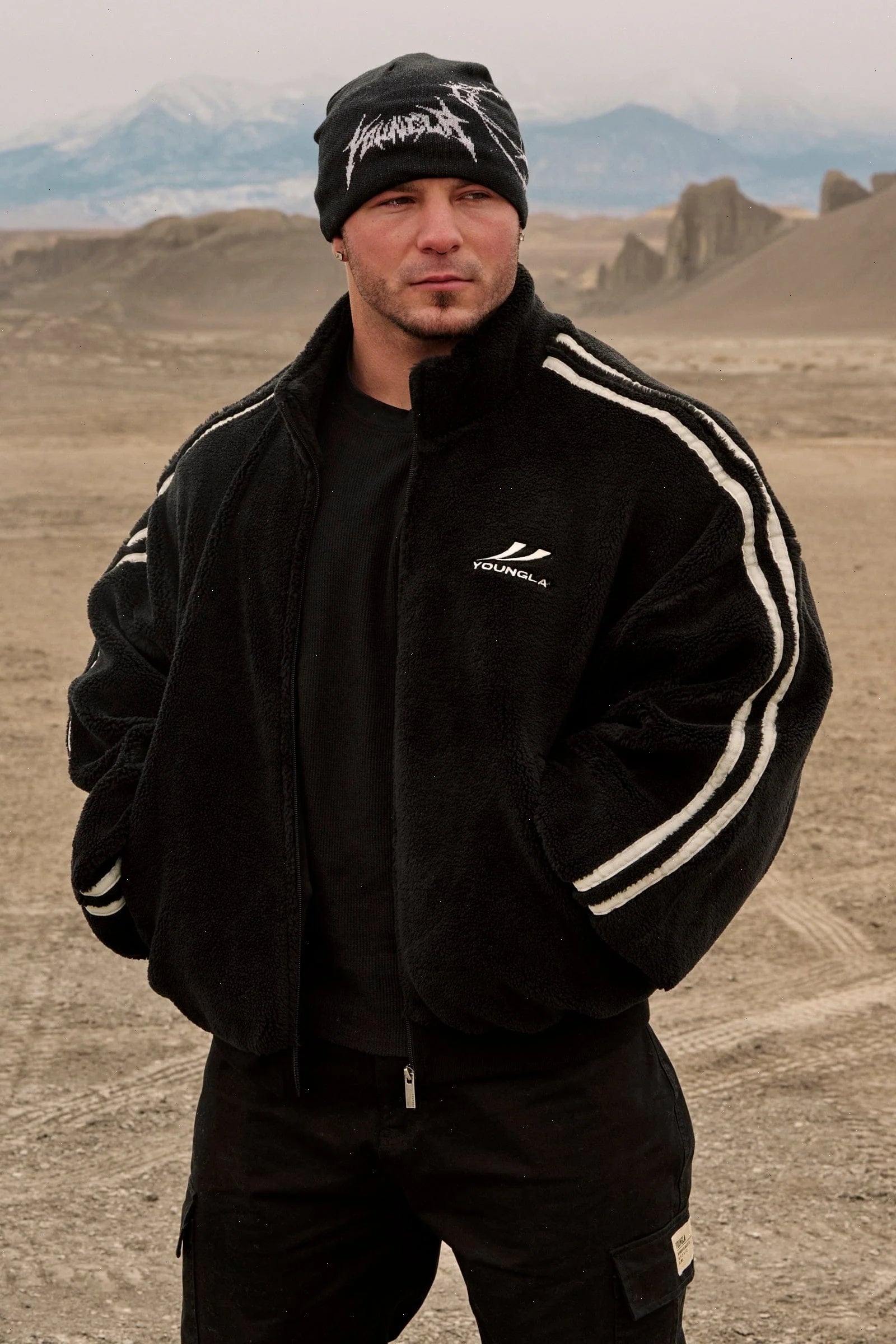 DESIGN: A warm, street-ready sherpa jacket built with a soft, high-pile exterior and a relaxed silhouette. Designed with contrast athletic taping along the sleeves for a retro-inspired look, plus elastic hem and cuffs to keep the fit shaped while still feeling roomy. The full-zip front and stand collar add practicality, making it easy to layer over tees or hoodies. Finished with clean YOUNGLA chest embroidery and subtle panel work that gives the jacket structure without sacrificing comfort.